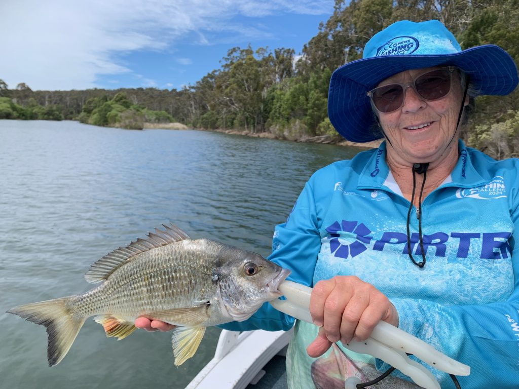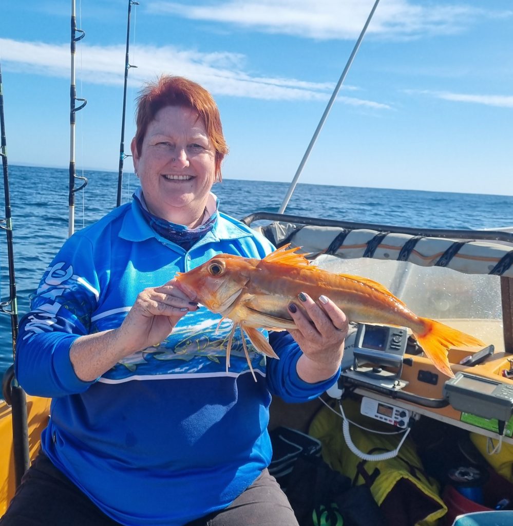 Fiona Beasley, happy with her catch of a sharp beaked gurnard measuring 50 centimetres. Caught in 80 metres of water off Mrimbula recently